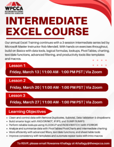Our annual Excel Training continues with a 3-session Intermediate series led by Microsoft Master Instructor Rob Mendell. Lesson 1 reviews the Basics (with Q&A) and moves into intermediate essentials: data tools (Subtotals, Remove Duplicates, Data Validation/dropdowns), logical formulas (AND/OR/NOT, IF/IFS, SUMIF/SUMIFS), and productivity features like Conditional Formatting, sheet protection, and key count/round functions.