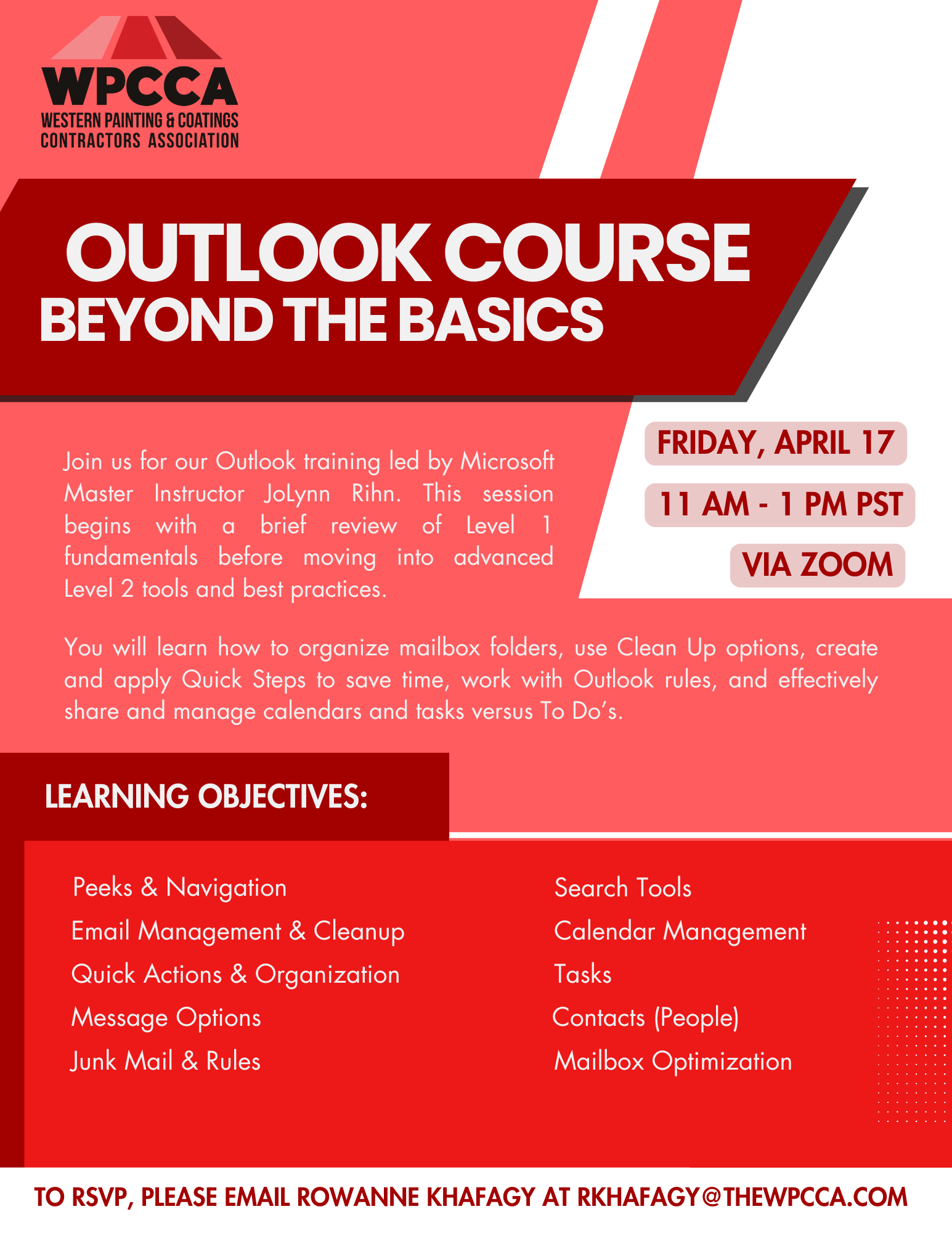 Join us for our Outlook training led by Microsoft Master Instructor JoLynn Rihn. This session begins with a brief review of Level 1 fundamentals before moving into advanced Level 2 tools and best practices. You will learn how to organize mailbox folders, use Clean Up options, create and apply Quick Steps to save time, work with Outlook rules, and effectively share and manage calendars and tasks versus To Do’s.